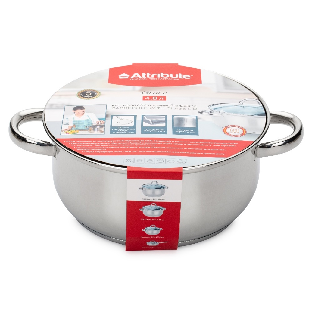 - Кастрюля нерж. сталь 4,8л Attribute GRACE со стекл. крышкой индукция ASG024