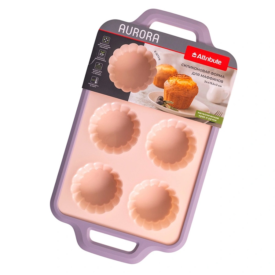 - Форма для выпечки силикон Кексы 6 ячеек 34*19,5см AURORA с ручками Attribute ABA111