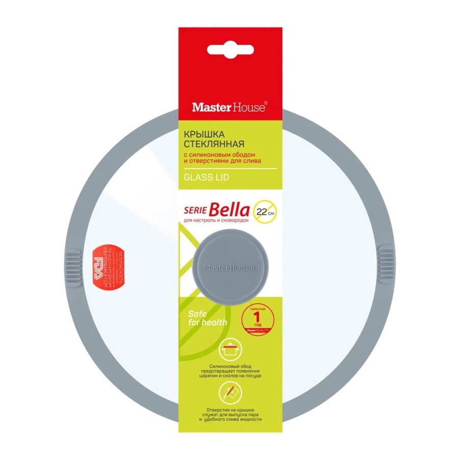 - Крышка 22см Master House БЕЛЛА стеклянная с силикон. ручкой и ободом (серый) 75645