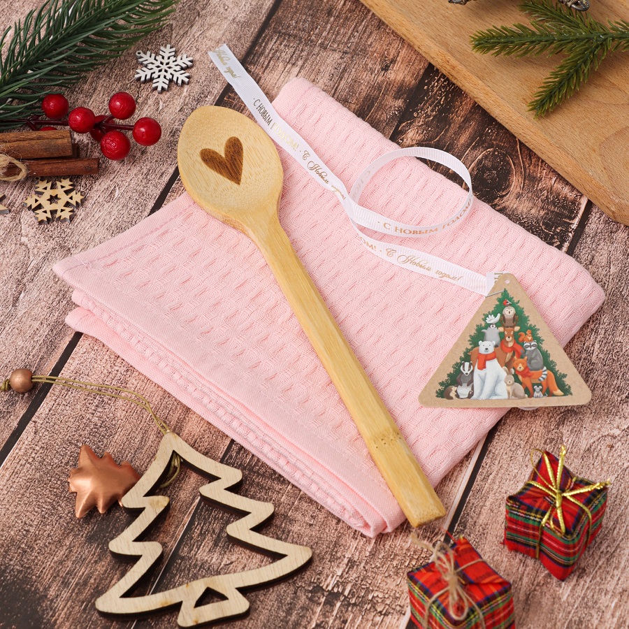 Комплектация: Полотенце размером 35×60 см и деревянная ложка — готовое решение для сервировки новогоднего стола или упаковки в качестве подарка.